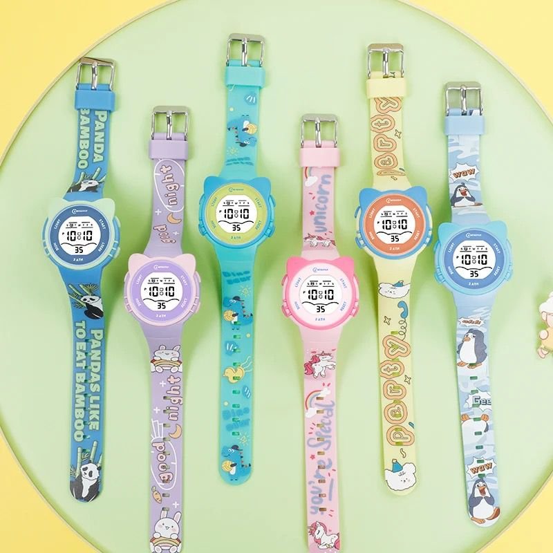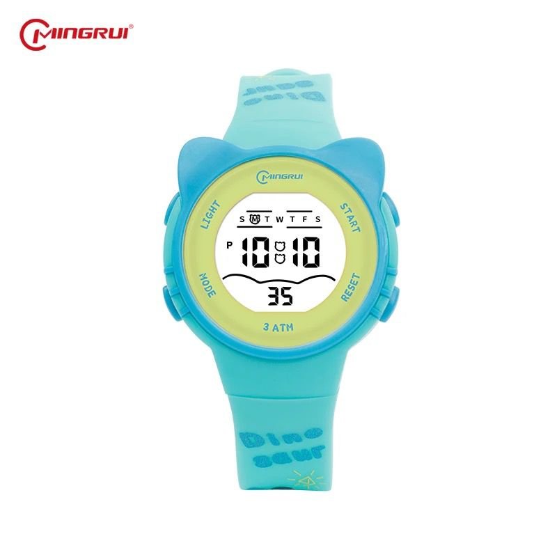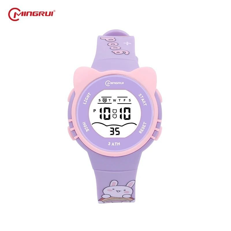 Montre digitale enfant licorne rose de marque Mingrui, avec affichage numérique clair (heure, minutes, secondes, jour de la semaine), fonctions mode/alarme/chronomètre, boutons de réglage (Light, Mode, Start, Reset), rétroéclairage LED, bracelet en silicone souple et confortable, boîtier léger et résistant, design ludique avec motif licorne, étanchéité 3 ATM (résiste aux éclaboussures), idéale pour un usage quotidien des enfants.