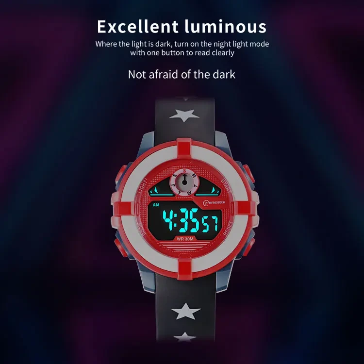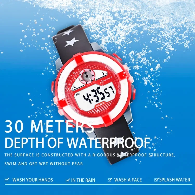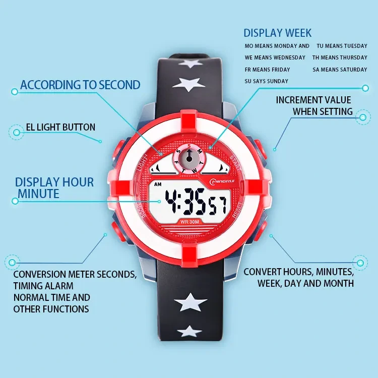 Cette montre digitale pour enfant est le compagnon idéal du quotidien ! Avec son écran facile à lire, elle permet de connaître l’heure en un clin d’œil. Pratique et amusante, elle dispose aussi d’une alarme et d’un chronomètre pour accompagner les petits dans leurs activités, à l’école comme à la maison. Conçue pour résister aux éclaboussures (30M), elle suit les enfants dans toutes leurs aventures. Son bracelet confortable s’adapte parfaitement au poignet pour un usage toute la journée. Une montre à la fois ludique, résistante et facile à utiliser, parfaite pour apprendre à gérer son temps tout en s’amusant !